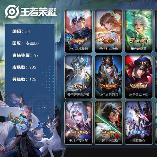 【V7 荣耀王者 英雄数量:126 皮肤数量:205 荣耀典藏:1个 传说皮肤:6个 稀有限定:8个 皮肤价值:144244】安卓Q-V7-Z强王者段位-126英雄-205皮肤-1典藏-0珍品无双-0无双-0珍品传说-6传说-56史诗 【荣耀典藏】:韩信弑枪猎影 【传说皮肤】:云缨幻光神枪,桑启鸣野蒿,赵云淬星耀世,李信一念神魔,刘备时之恋人,达摩黄金狮子座 【限定皮肤】:姜子牙天穹之誓,狄仁杰阴阳师