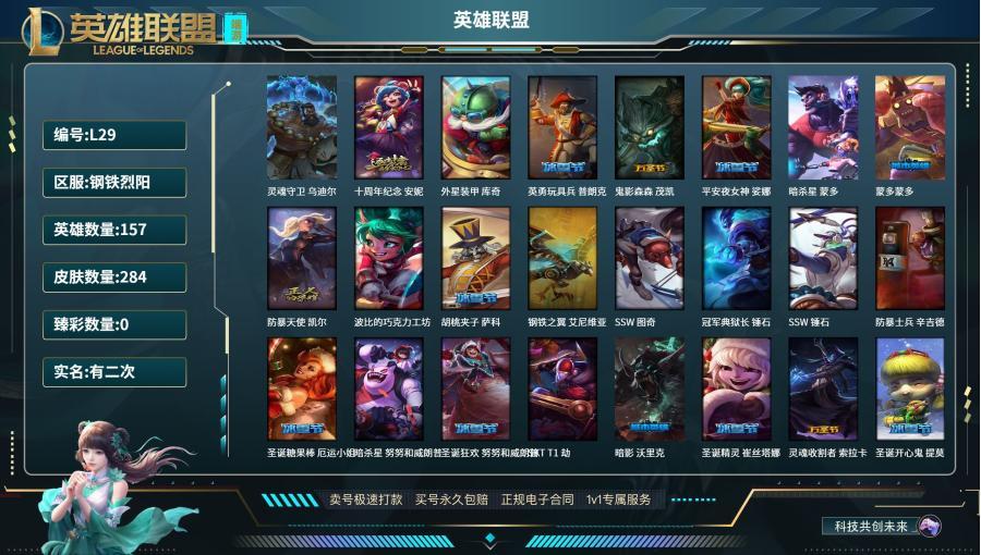 【可二次 等级:263 英雄数量:157 皮肤数量:284 神话数量:1 炫彩数量:0 限定皮肤:暗影沃里克,防暴天使凯尔,红桃杰克崔斯特,蓝色忧郁崔斯特 灵魂守卫乌迪尔 十周年纪念安妮 铁哥们儿奥拉夫,恶魔男爵瑞兹,欧米伽小队幽灵特工,绅士科加斯,律政大亨蒙多,电玩女神娑娜,女警狙击凯特琳,冰川巨兽墨菲特,银河魔装机神兰博,第三类接触黑默丁格,腥红之月鬼武姬阿卡丽,死亡骑士盖伦,黯黑魔龙希瓦娜,偶像歌手阿狸,苍穹之光韦鲁斯,奥德赛凯隐 美猴王孙悟空,碧玉之牙卡西奥佩娅,醒狮克格莫,银龙裁决泰隆